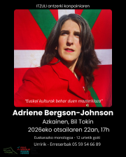 En ces temps sombres du XXIe siècle, l'entrepreneuse texane Adriene Bergson-Johnson a vu la lumière et est prête à sauver la culture basque. Expérimenté dans d'énormes projets à travers le monde, elle vient partager ses techniques de gestion pour ramener notre pays au sommet. Dans cet exercice de coaching collectif, la conférence d'Adrien nous permet de sortir la culture basque du folklore et de l'établir devant un miroir particulier. Et vous, bascophone du XXIe siècle, osez-vous vous placer devant ce miroir ?