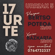 Le 05 octobre 2024 le Gaztetxe d'Ascain fête ses 17 ans.Au programme de cette journée : 11h Bertso Poteo sur la place, 13h repas et concerts au fronton Chourio et pour finir Dj Jow au Gaztetxe .Réservation au 07 64 73 23 37