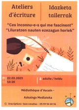 Ateliers d'écriture"Ces inconnu-e-s qui me fascinent"22.03.202514:30Pour les adultesMédiathèque d'AscainInscriptions : 05 59 54 68 36