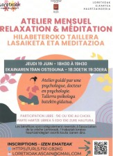 Atelier mensuel de relaxation et méditation.Jeudi 19 juinInscription : loretxoak.ascain@gmail.com