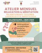 L'association Loretxoak propose des ateliers de relaxation et de méditation, les 3e jeudi du mois de 18h30 à 19h30. Ces ateliers sont guidés par une psychologue, docteur en psychologie.
