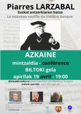 .Euskaltzaindia a convié cette année les conférenciers Ixabel Etxeberria et Jon Casenave afin d'évoquer Piarres Larzabal, écrivain, prêtre et académicien d'Ascain, son parcours et bien sûr son œuvre majeure en faveur du théâtre populaire en langue basque. Pantxoa Etxegoin présentera la conférence (gratuite) à Biltoki et proposera des témoignages vidéos (avec Daniel Landart proche de P.Larzabal et des images d'archives de Larzabal) ainsi que des lectures choisies