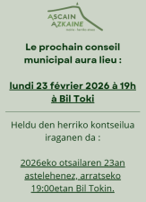 La prochaine réunion du conseil municipal aura lieu le lundi 23 février 2026 à 19h en salle Bil Toki. Ordre du jour du 23 février 2026