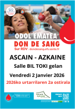 Don de sang à la salle Biltoki le vendredi 2 janvier 2026 de 15h à 19h.Sur rendez-vous : dondesang.efs.sante.fr
