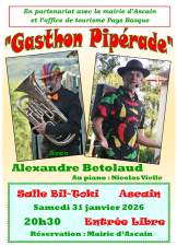 Gasthon Pipérade est un spectacle musical dédié à la chanson française, entre humour, tendresse et imagination. À travers des chansons d’hier et d’aujourd’hui, le spectacle rend hommage à Bourvil, Bobby Lapointe, Trenet ou encore Les Frères Jacques, tout en laissant une large place aux créations originales de Gaston Labetol (Alexandre Betolaud).