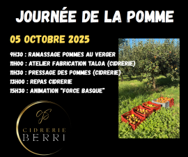 Le dimanche 5 octobre, la Cidrerie Berri ouvre ses portes pour une grande fête de la pomme et des traditions basques. Dès le matin, petits et grands pourront participer au ramassage de pommes dans le verger, avant de découvrir le pressage et la fabrication du cidre. La matinée se poursuivra avec un atelier de confection de taloa, pour mettre la main à la pâte et savourer les spécialités locales.