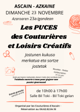 Les Couturières d’Ascain vous invitent à participer aux Puces des Couturières et Loisirs Créatifs, qui se tiendront le dimanche 23 novembre, de 10h00 à 17h00, à la Salle Bil Toki à Ascain.