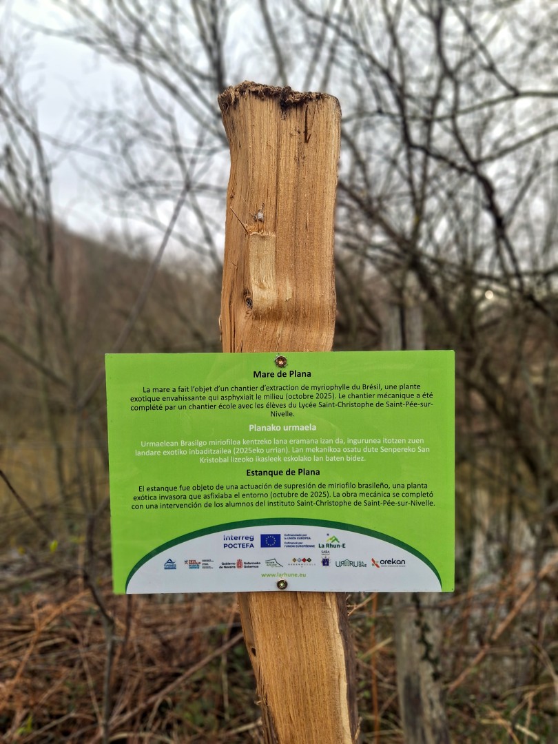 Le myriophylle du Brésil est une plante exotique envahissante qui s’est développée dans la mare de Plana d’Ascain depuis quelques années. En colonisant cet espace, elle perturbe l’équilibre global de la mare ainsi que la vie qui s’y trouve (amphibiens, insectes, flore, etc.).Une première intervention mécanique a déjà été réalisée en octobre 2025 afin de limiter sa propagation (arrachage d’environ 60 m³). Une action manuelle sera également menée en complément dès le printemps par les élèves du lycée Saint-Christophe de Saint-Pée-sur-Nivelle. Cette action collective permettra ainsi la réservation de ce site naturel et de sa biodiversité.
