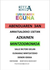 L'association HizaMintza organise à l'occasion de la journée de la langue Basque (Euskara) à Azkaine, un mintzodromoa ( en Euskara) le 3 décembre à 15h à la salle Bil Toki.