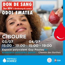 Le don de sang sera à Ciboure le jeudi 03 et vendredi 04 juillet de 15h à 19h à l'espace polyvalent Guy Poulou, Chemin des Barthes.