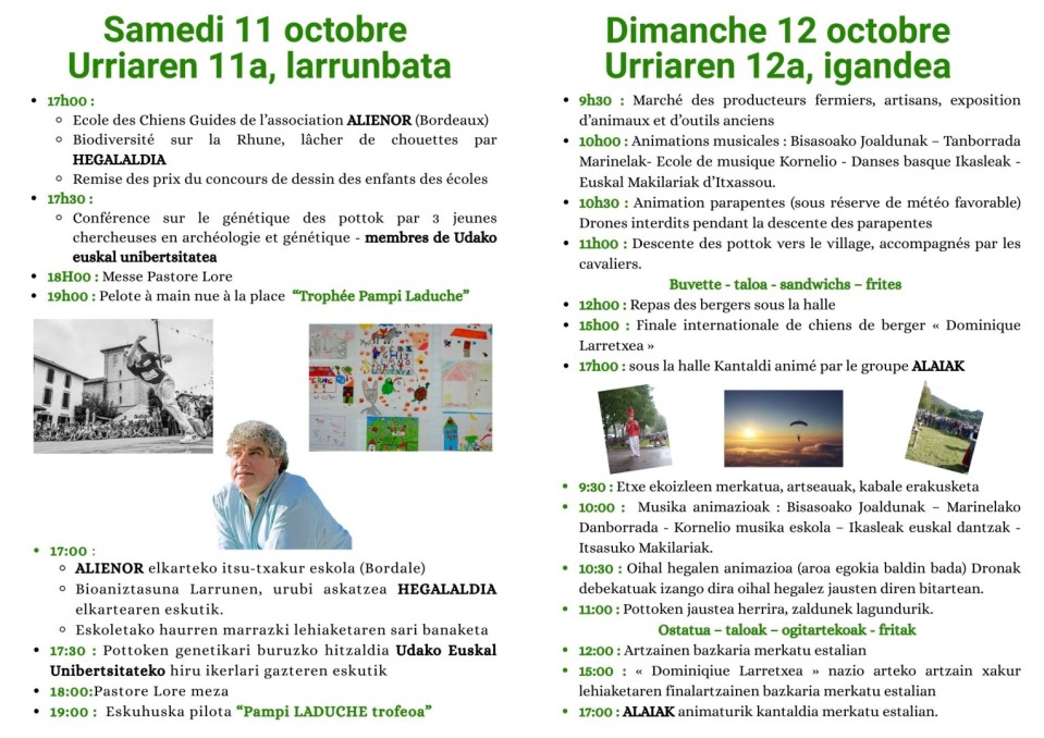 Le concept de cette fête et sa réussite sont dus à l’association de la transhumance des brebis, pottok, vaches, ainsi que la présence des producteurs locaux. Le tout agrémenté par un volet culturel important : danseurs, musiciens, chanteurs, joaldunak sonneurs de cloches, etc..Le concours international de chiens de berger attire, l’après-midi, un nombreux public. Un kantaldi (concert) de chanteurs basques clôture la journée.