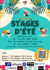 Cet été l'association organise pendant les trois premières semaines de juillet 2025 des stages de gymnastique artistique où les enfants de 6 ans et plus pourront découvrir et apprendre à faire de la gymnastique artistique, mais aussi du Parkour et de l'acrosport de manière ludique, dans une salle spécialisée de gymnastique. D'autres activités seront au programme, comme des activités manuelles, des jeux sportifs et une sortie à la piscine de Saint de Luz les mercredis. Les enfants peuvent s'inscrire sur une ou deux semaines. Les prix sont à 70 euros pour les enfants adhérent au club et 80 euros pour les non adhérents.