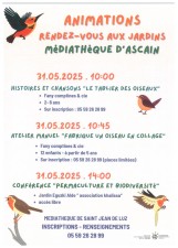 La médiathèque organise les Rendez-vous aux jardins samedi 31 mai. A partir de 10h, histoires et chansons pour les enfants entre 2 et 6 ans. Puis atelier manuel pour les enfants à partir de 5 ans.