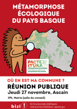 A la suite de la sortie des résultats du bilan du mandat, Bizi organise une réunion publique de présentation du bilan, et du Pacte 2026 pour le Climat et les habitant·es du Pays Basque. Venez découvrir les principales leçons de ce mandat, et les propositions de mesures à mettre en place pour un Pays Basque plus soutenable, plus juste et plus solidaire.