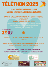 Le Téléthon 2025 aura lieu le samedi 6 décembre sur la place d’Ascain. À cette occasion, une sortie cyclotourisme sera organisée à 8h30, ouverte à tous. Le départ se fera depuis la place d’Ascain. Le casque est obligatoire et le port de vêtements fluos est recommandé. Tout au long de la matinée, plusieurs animations seront proposées :