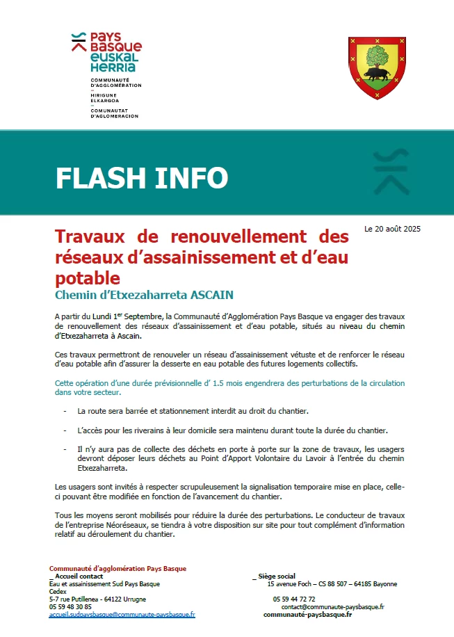 A partir du Lundi 1er Septembre, la Communauté d’Agglomération Pays Basque va engager des travaux de renouvellement des réseaux d’assainissement et d’eau potable, situés au niveau du chemin d’Etxezaharreta à Ascain.