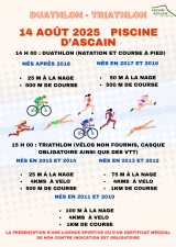 Comme chaque année le pôle jeunesse de la mairie organise dans le cadre des fêtes d'Ascain un triathlon et un duathlon destinés aux jeunes. Les épreuves auront lieu à la piscine d'Ascain le jeudi 14 août 2025 à partir de 14h et de 15h.